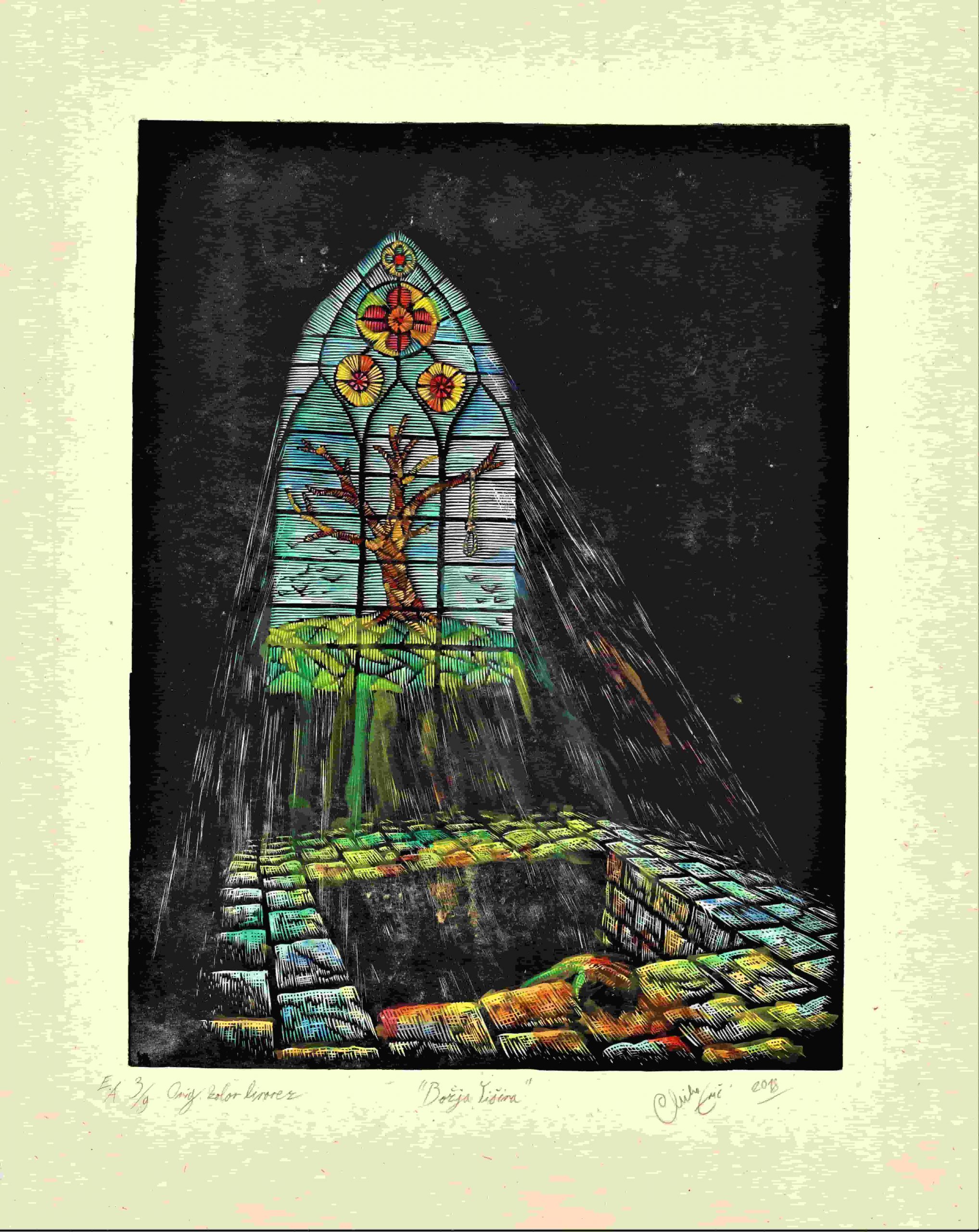 23 x 30.5 cm (matrica) The silence of God, hand coloured linocut 2018, 23 x 30.5 cm (matrix)