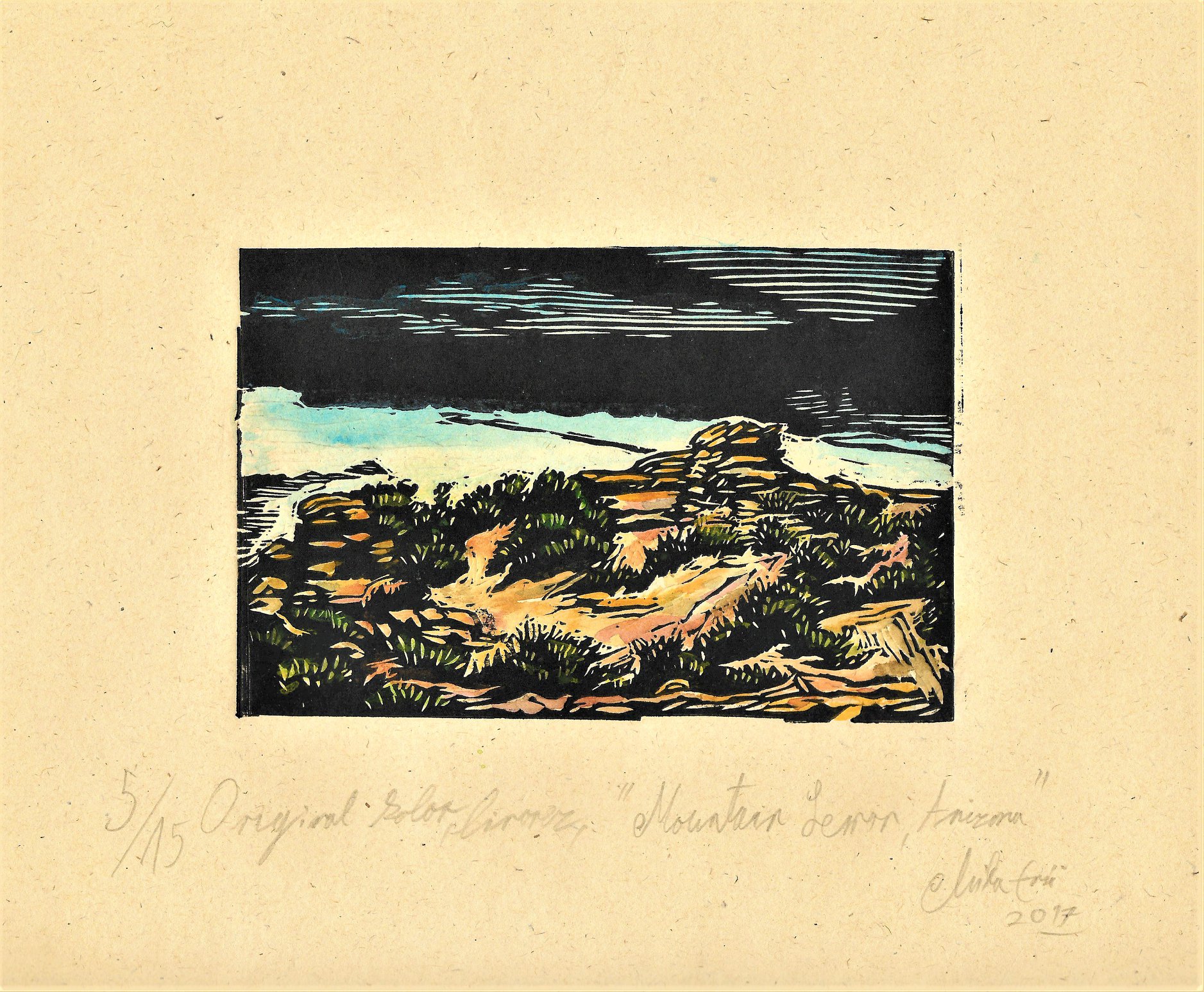 Mountain Lemon, Arizona, hand coloured linocut 2017, 15 x 9.9 cm (matrix)