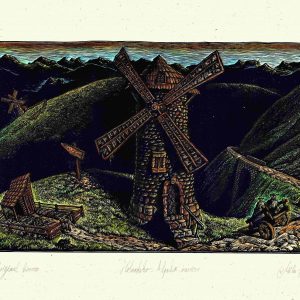 20 x 15.7 cm (matrica) People’s cultural home Mežica, hand coloured linocut 2017, 20 x 15.7 cm (matrix)