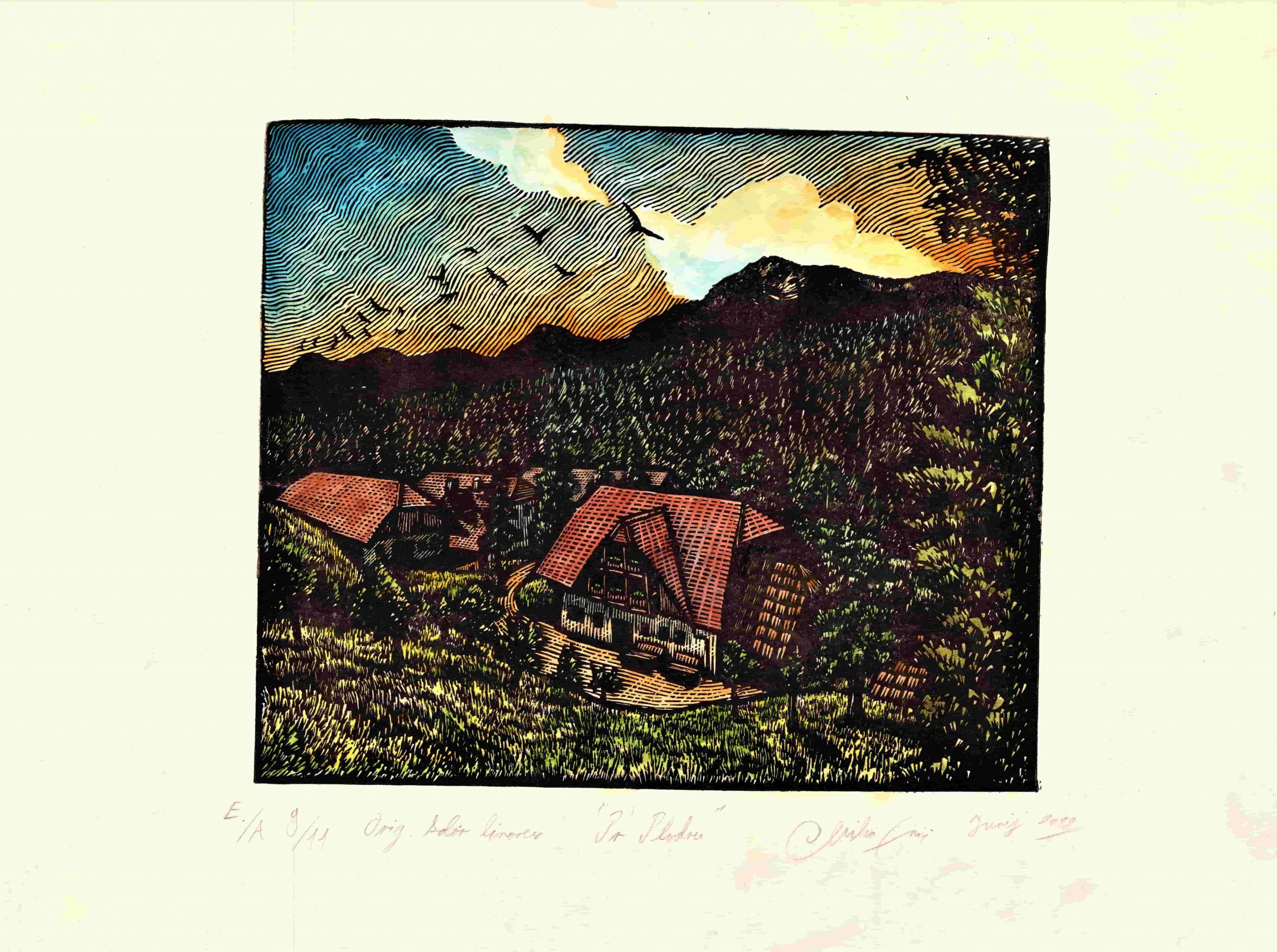 23.5 x 19.7 cm (matrica) At Plodr, hand coloured linocut 2018, 23.5 x 19.7 cm (matrix)